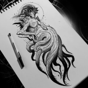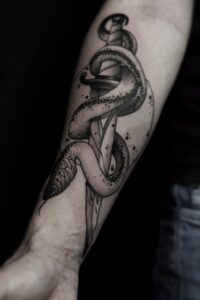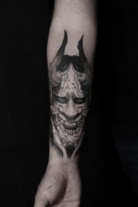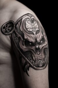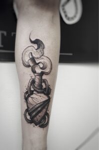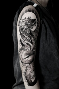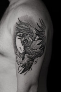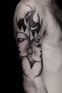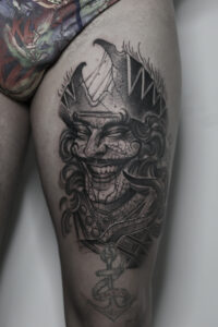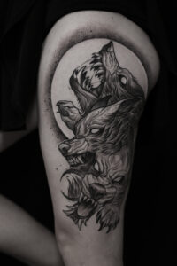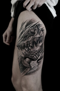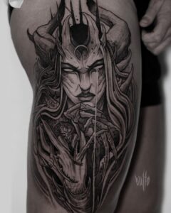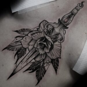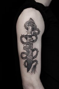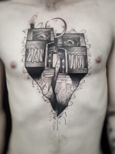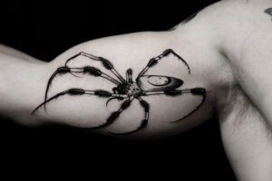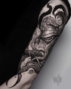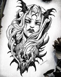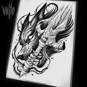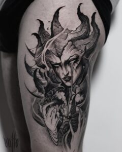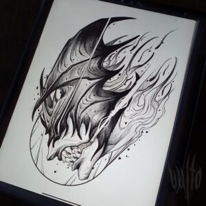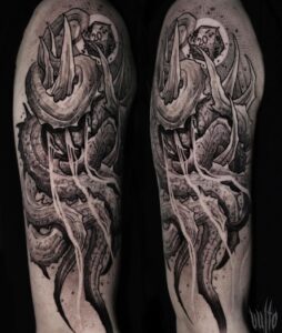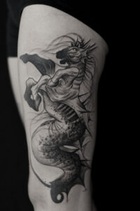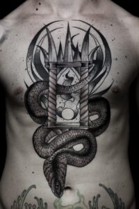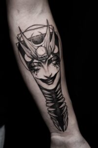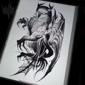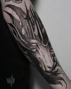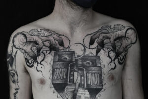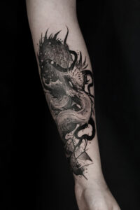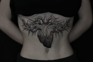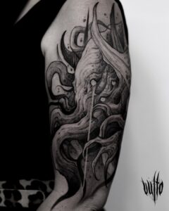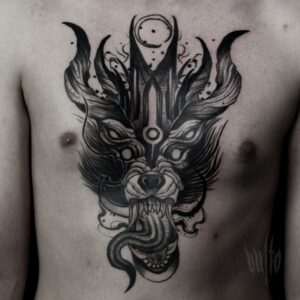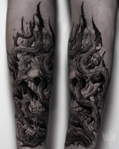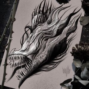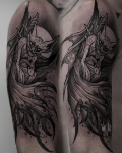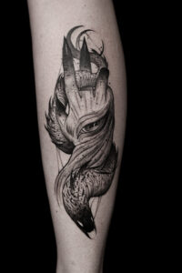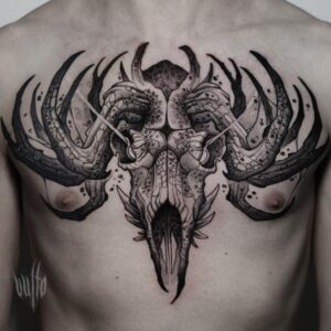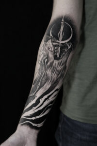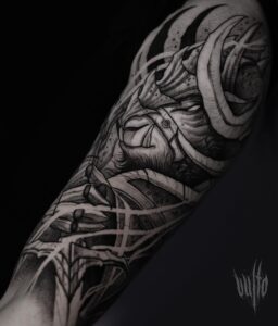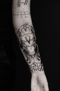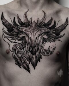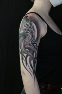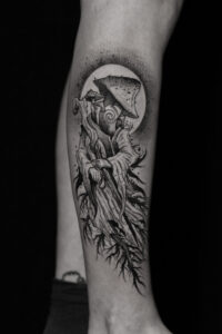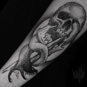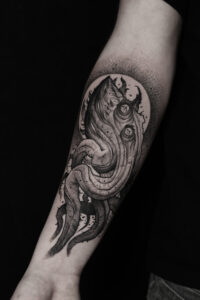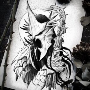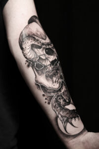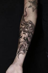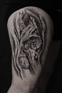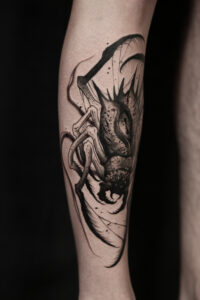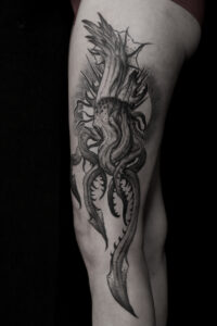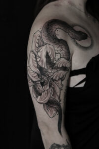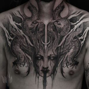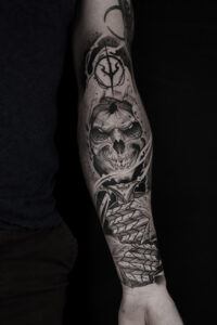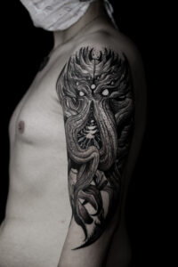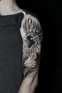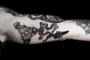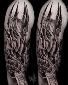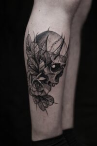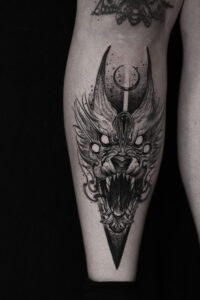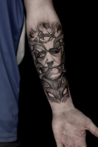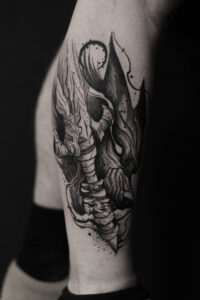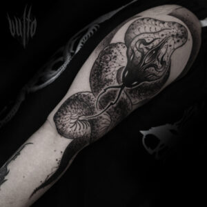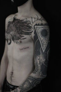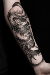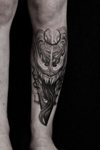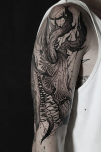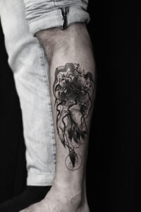 Spécialiste du blackwork, il travaille dans un style dark, parfois mélangé avec du réalisme dont les iconographies en nuance de gris démontrent sa maîtrise du clair obscur. Passionné par les univers sombres, gores et horror-fantasy, il sera ravi de te composer un ensemble lugubre peuplé d’animaux, de chimères, d’os ou encore d’architecture gothique.